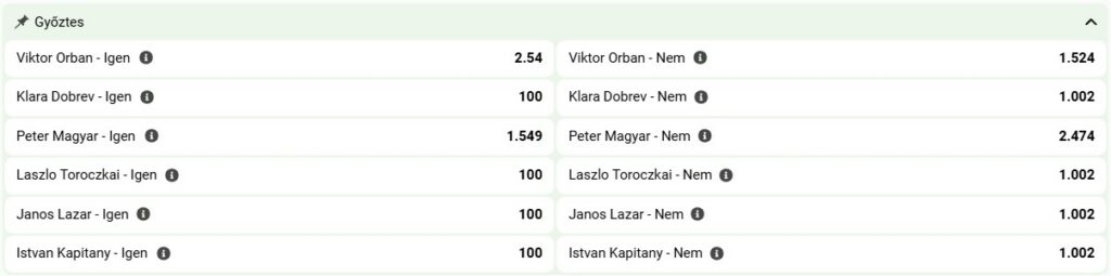 A BetLabel aktuális szorzói alapján Magyar Péter győzelme fizet kevesebbet, vagyis a TISZA Párt elnöke számít az esélyesebbnek. Magyar Péter sikere jelenleg 1.49-as szorzón fogadható, míg Orbán Viktor újabb választási győzelme 2.54-as szorzóval fogadható.
