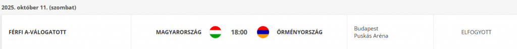 Os ingressos para o jogo das eliminatórias da Copa do Mundo entre Hungria e Armênia, marcado para 11 de outubro, estão esgotados. No sistema de venda de ingressos disponível no site da MLSZ não há mais possibilidade de adquirir entradas, ou seja, a venda oficial de ingressos já foi encerrada. Ainda é possível conseguir ingressos no mercado negro ou por meio de diversos sorteios e promoções.